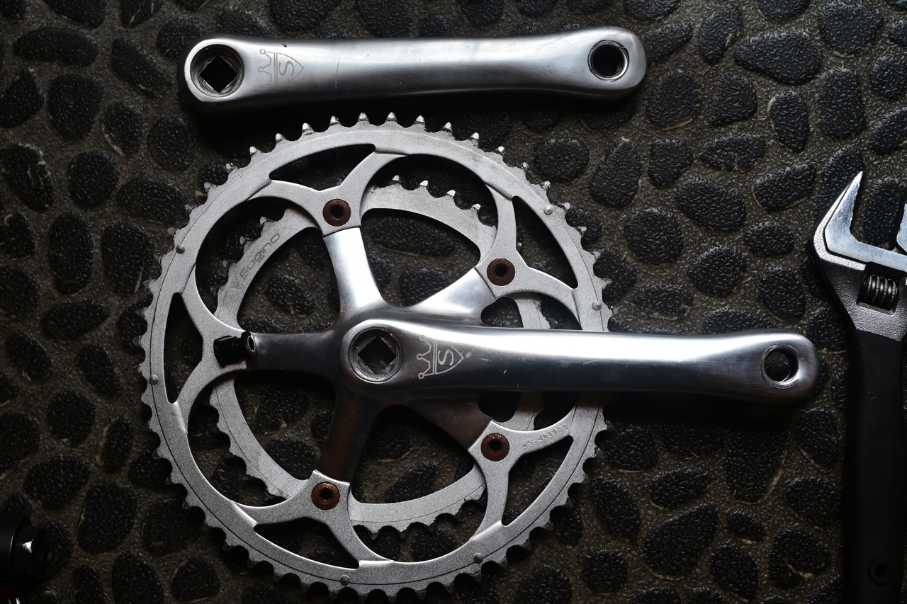 部品も使えるものは再利用します。 特にクランクは スギノのクランクで